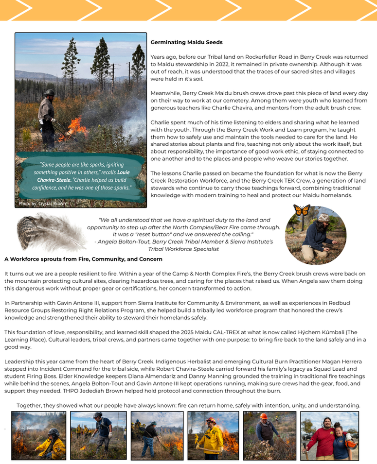 The Tyme Maidu people have lived in the land now known as Butte County since time immemorial. This means that our history, our worldview, and our relationships with the land, water, and non human relatives in our ancestral territory stretches back to the beginning of time. Our relationship with this place drives our work. We know how important it is to protect these relationships so that our children and grandchildren can continue our ways of life into the future.